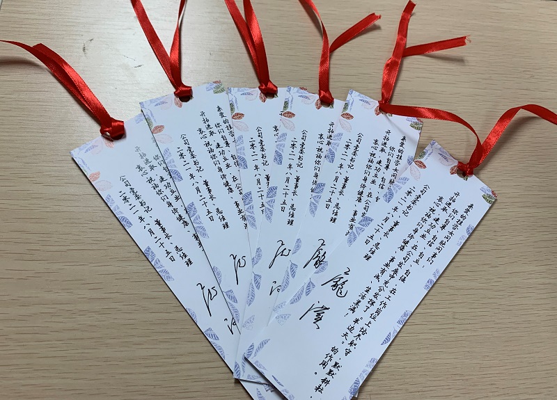 公司黨委書記、董事長、總經(jīng)理龐漢為活動紀念品定制版書簽寫寄語