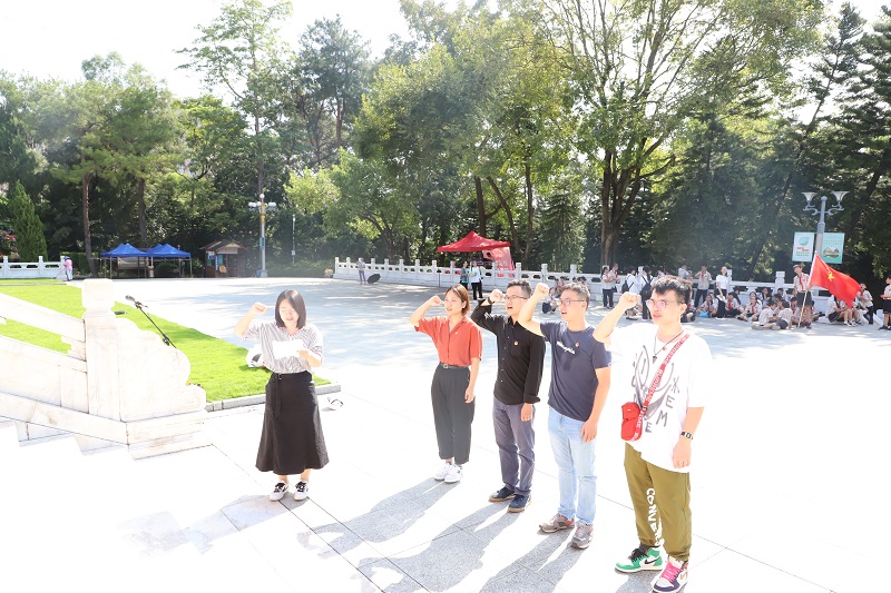 青年團(tuán)員在紀(jì)念碑前合影