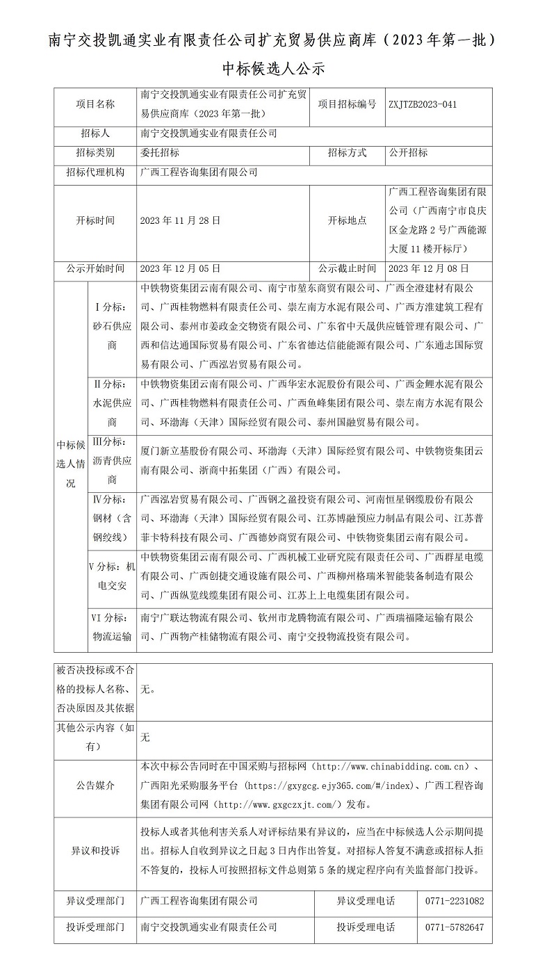 南寧交投凱通實業(yè)有限責任公司擴充貿(mào)易供應商庫(2023年第一批) 中標候選人公示
